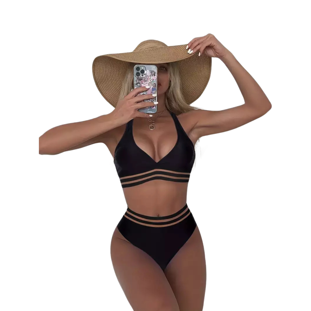 Tento nádherný černý bikini set má síťované lemy podél kalhotek a topu. S vázáním za krkem a bez zapínání na zádech.