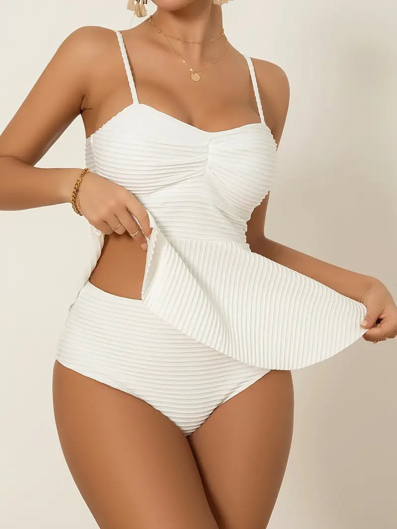 Buďte sebevědomá a elegantní s peplum tankini soupravou Marina! Lichotivý peplum střih jemně zakrývá oblast pasu a vytváří krásnou siluetu, zatímco měkká strukturovaná tkanina působí luxusním dojmem. Tenká ramínka umožňují dokonalé přizpůsobení a vyšší střih spodního dílu podtrhuje vaši postavu stylovým způsobem. Ideální volba pro pohodlný den na pláži nebo u bazénu – bez kompromisů v pohodlí a volnosti pohybu!